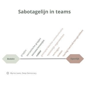 Myrna Lewis plaatste de verschillende vormen van sabotage op een zogenaamde ‘sabotagelijn’. De sabotagelijn is een model uit Deep Democracy. Deze lijn loopt van subtiele, bedekte vormen tot aan openlijk verzet. Het begint bij een grapje en sarcasme, gaat over in roddelen en gestopte communicatie en langzaam verandert de vorm in het opzettelijk tegenwerken en vertragen, om te eindigen in staking of zelfs vertrek.